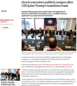Many already know that in 2016, when the co-CEO of Oracle, Safra Catz, (a company that began life as a database company) told President-elect Trump that “we are here to help you in any way” I resigned from Oracle. And while I’d published my resignation letter on Linked In, I didn’t expect coverage from The Guardian, the New York Times, and other news outlets.