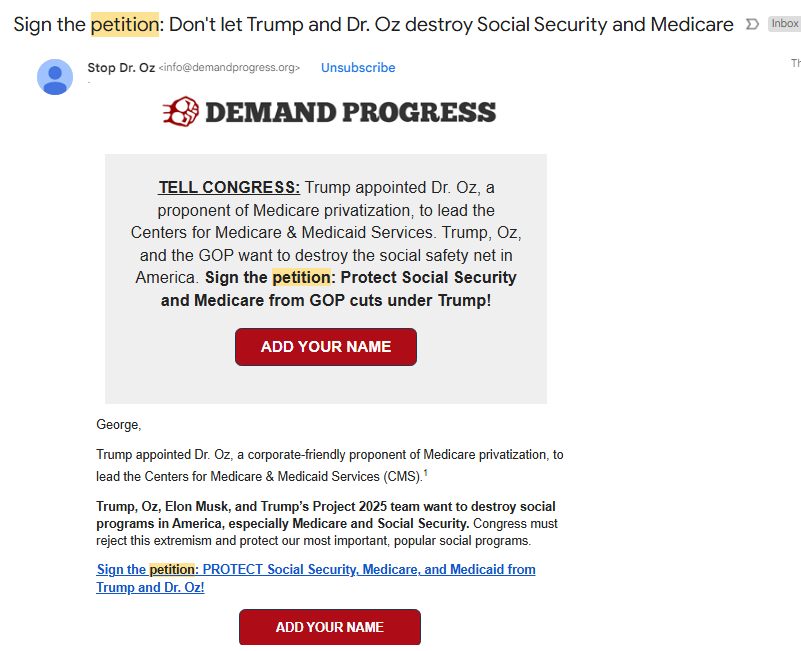 Furthermore, many progressive organizations have succumbed to a narrow focus on a similar, failed strategy. The concept of organizations growing their email distribution lists by distributing petitions with subjects in ALL CAPS! Such as “TELL THOMAS AND ALITO TO ACT ETHICALLY NOW!”, or “STOP PROJECT 2025!!! SAY NO TO TRUMP!!!!!” as though 50,000 electronic petition signatures will miraculously cause the criminal-elect Trump to reconsider destroying the Affordable Care Act, the environment, and public education when approximately 75 million people voted against him. A basic value of a petition is gathering a name, an email address, and an affinity an individual may have regarding a specific issue, to use the information for fundraising later. I’m not saying petitions are useless, they are useful in raising societal awareness of issues that might otherwise not be exposed such as stopping future environmental disasters like the Keystone Pipeline Project, creating more momentum for stopping the use of U.S. weapons in Gaza, or the egregious acts of an out-of-control prosecutor and justice system pursuing someone like Aaron Swartz. (See trailer for film about Aaron).