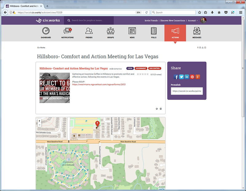 On a daily basis we have hundreds of local, state, regional and nationwide “civic action engagement opportunities” flowing through the system ranging from resistance, policy and advocacy groups like Everytown for Gun Safety, Black Lives Matter, Indivisible, Moms Rising, the ACLU, United We Dream, Sierra Club, Organizing for America, Greenpeace and many more. We match the actions to our growing number of subscribers (we are a non-profit and are subscriber-supported) based upon the issues they care about and their geographic location and do not overwhelm them. You won’t find “Do these 10 things now or the world will end!” on civ.works. You will also not generally find petitions. When our subscribers perform an action they can “check-in” gaining civic action points on our platform.