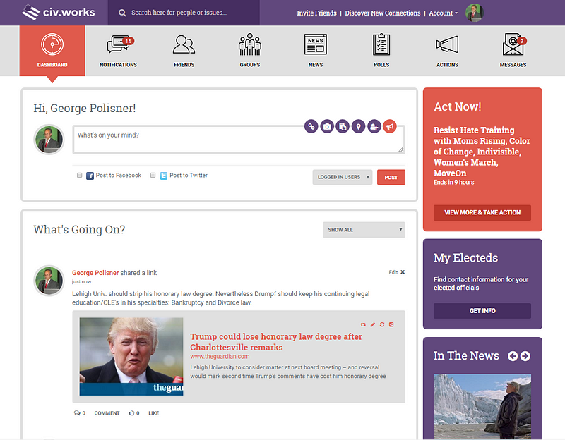 We determined that while working purely on legislation would be a “heavy-lift” for any of us (despite my own background of having worked for a few years for the Legislative Counsel) there is a spectrum of meaningful civic action that could be supported by a civic engagement platform concept. We engaged Arck Interactive in Portland, Oregon and provided the conceptual design of the civ.works platform. This was to be a “democracy machine” for all of us. It would use a privacy-protected (no selling data to anyone), ad-free social network as something of a “gateway drug” to sustained, meaningful civic action. We launched on February 14 of this year (for the love of democracy) and are continuing to add powerful new features and functionality to the platform.