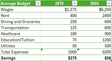 To compare, in 2024, while salaries are higher, they have not increased with living costs. Average college/university tuition went from $1,318/year to $11,260/year. Healthcare insurance went from less than $100/month to $650/month -and significant costs in the form of co-pays, denied claims, and deductibles mean your healthcare costs have exploded well beyond the insurance outlay. And the average cost of a starter home has gone from $60K to $800K.