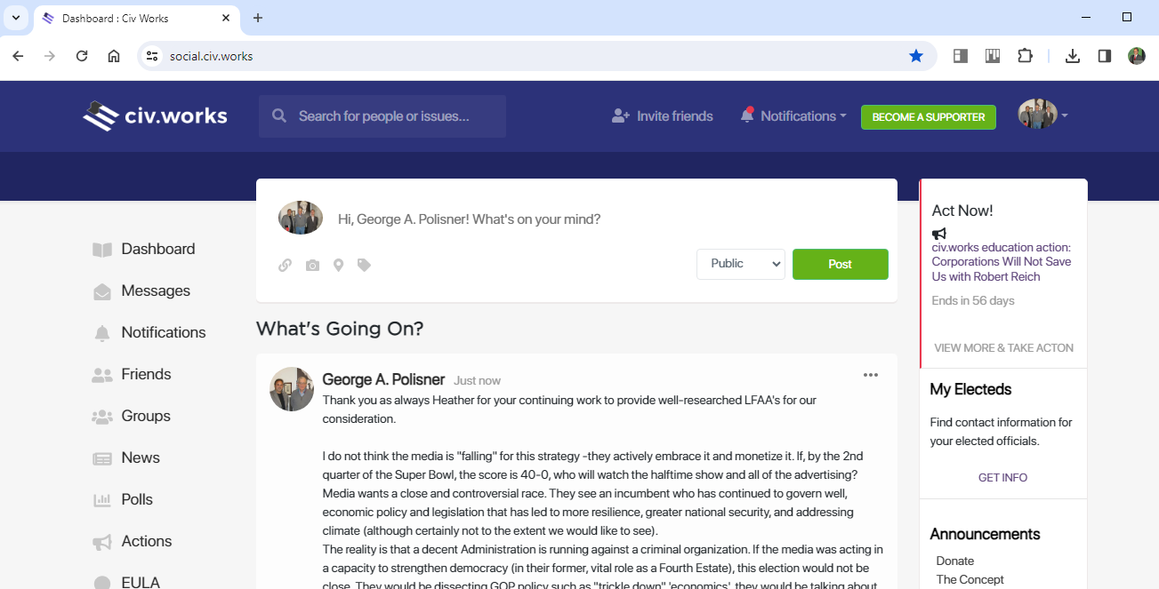 In the United States, in 2024, democracy is on the ballot. Recent research states that 75% of people consume their news on social platforms. With so much at stake, do you trust Musk and Zuckerberg -or is it time for an ad-free, subscriber-supported civic social network that doesn't sell or share data with marketers, shadowy political operatives, or billionaires?