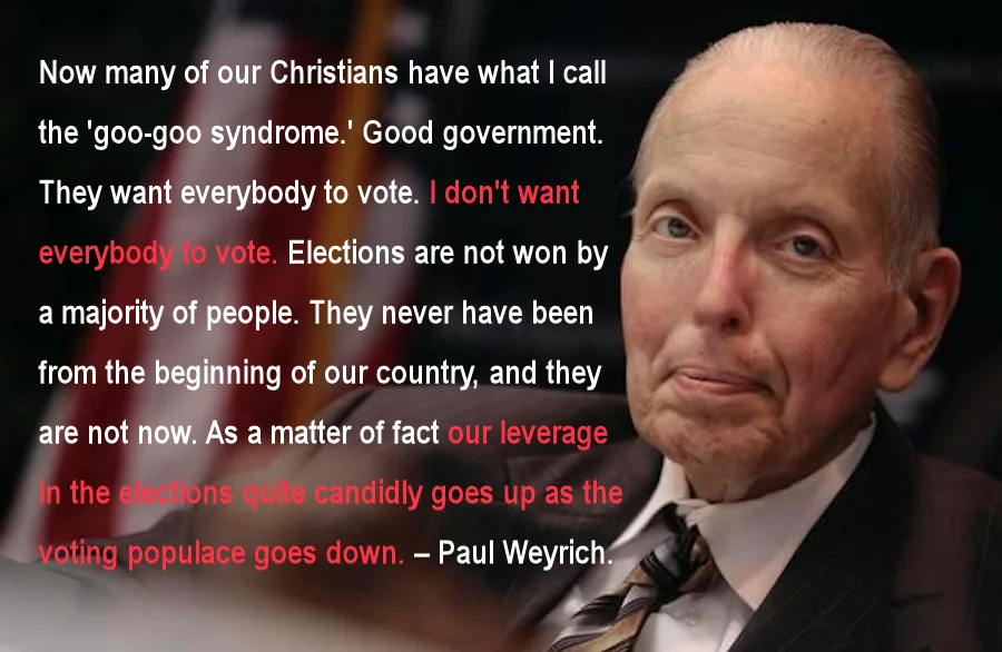 Paul Weyrich also co-founded the nefarious American Legislative Exchange Council (ALEC). They continue to provide draft legislation for local, State, and Federal government supporting initiatives such as “Right to Work” which weakens employee protections, “Stand Your Ground” which provides a defense for the murder of people of color when a white person is “afraid”. He was also connected to Jerry Falwell and the “Moral Majority” who have worked across generations to politicize religion in the United States and shatter the separation of church and state.