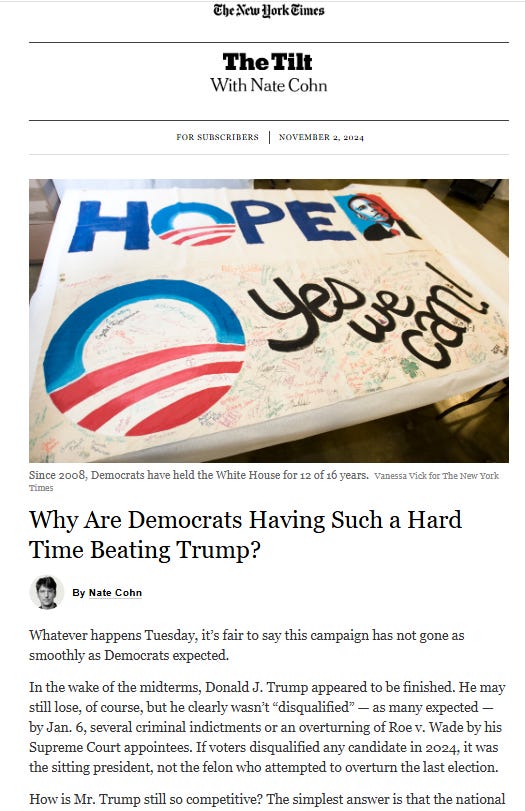 Democrats are having a tough time beating Trump, because the mainstream media in 2016, 2020, and again in 2024 covers him 24x7 as a viable candidate with important economic, domestic policy, and foreign policy plans. Healthcare plans. Grandiose plans. Instead calling him a non-viable candidate for anything other than prison for his pattern of corruption and numerous crimes. At the end of the campaign, the New York Times (unlike their Washington Post and Los Angeles Times counterparts) at least warned about the elevation of a lawless and corrupt incompetent Trump.