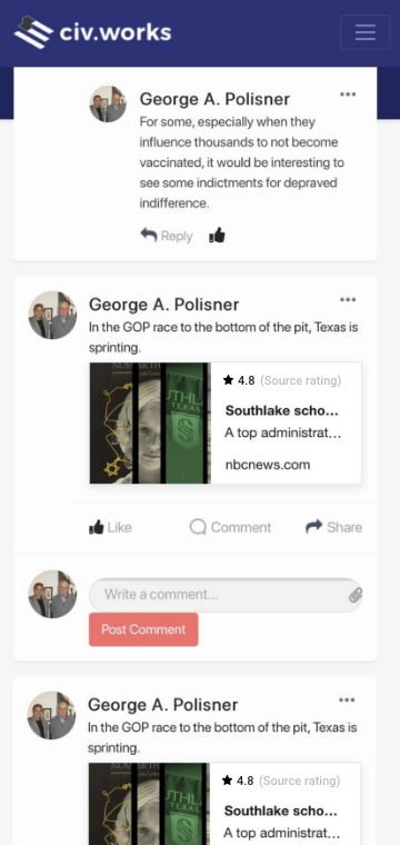 While there is a very early pilot available at https://social.civ.works, the roadmap includes news/information ratings from trusted and emerging sources, local, regional, national, and global news revenue-sharing partnerships, information about elected officials and candidates from trusted entities such as OpenSecrets.org, elected member-constituent engagement through our partnership with PlaceSpeak.com, and aside from general social content, opportunities for effective civic action at the local, regional, state, national, and global levels.