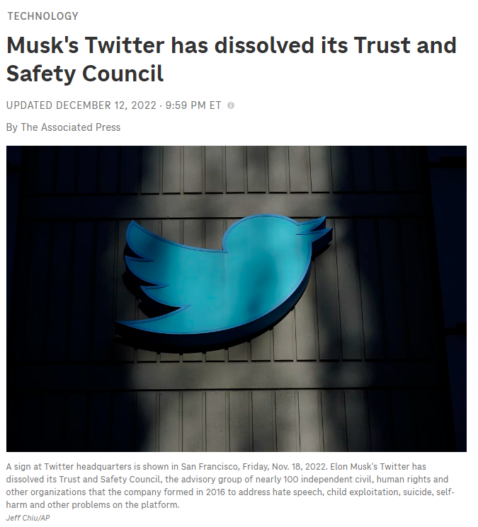 Musk fires trust and safety team: https://www.npr.org/2022/12/12/1142399312/twitter-trust-and-safety-council-elon-musk