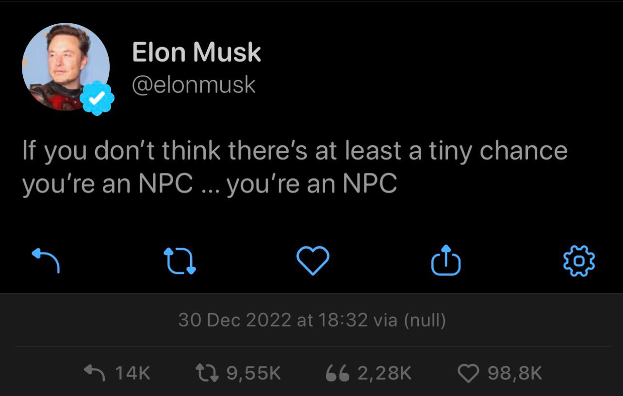 Elon Musk told us we are NPCs, “non-player characters.” NPCs are background collateral damage in games he apparently enjoys when he’s not funding and amplifying right-wing extremism, exposing formerly secure Social Security and Medicare data, directing the construction of spacecraft that explode over the Gulf of Mexico, or overseeing the manufacture of self-immolating vehicles.