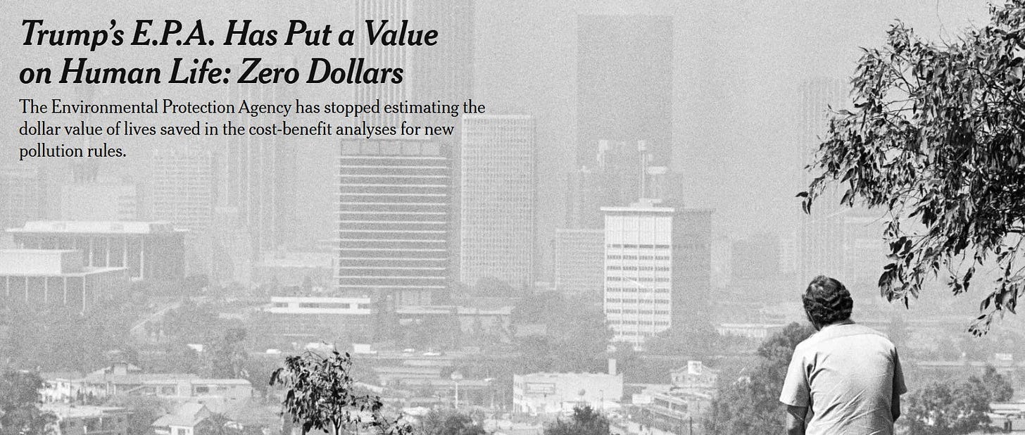 Before Zeldin, the EPA used figures between roughly $9 million and $11 million per person in environmental studies and analysis. Under Zeldin and Trump, that number is now $0. If you wear a red hat, you are worth nothing. If you don’t wear a red hat, still zero. Your children are worth zero. Your grandchildren are worth zero.